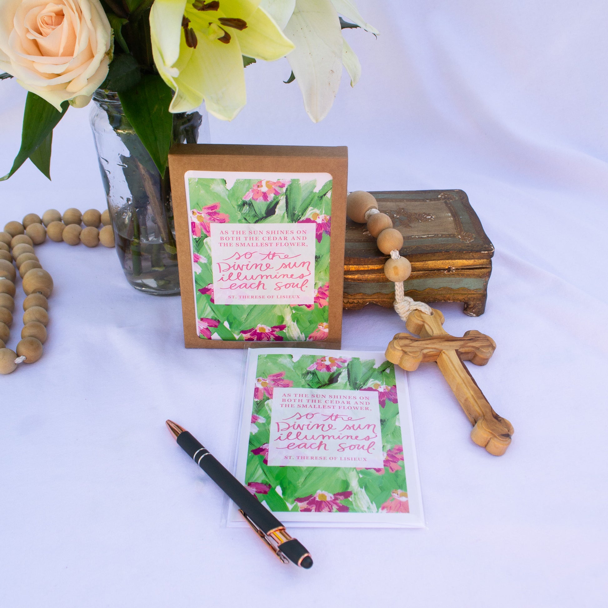 St. Therese eloquently speaks of the reality of God's grace for each soul, showing the particularity of God's providence. This card reflects the diversity of God's creation and how he provides specifically and intentionally for all of His creatures.