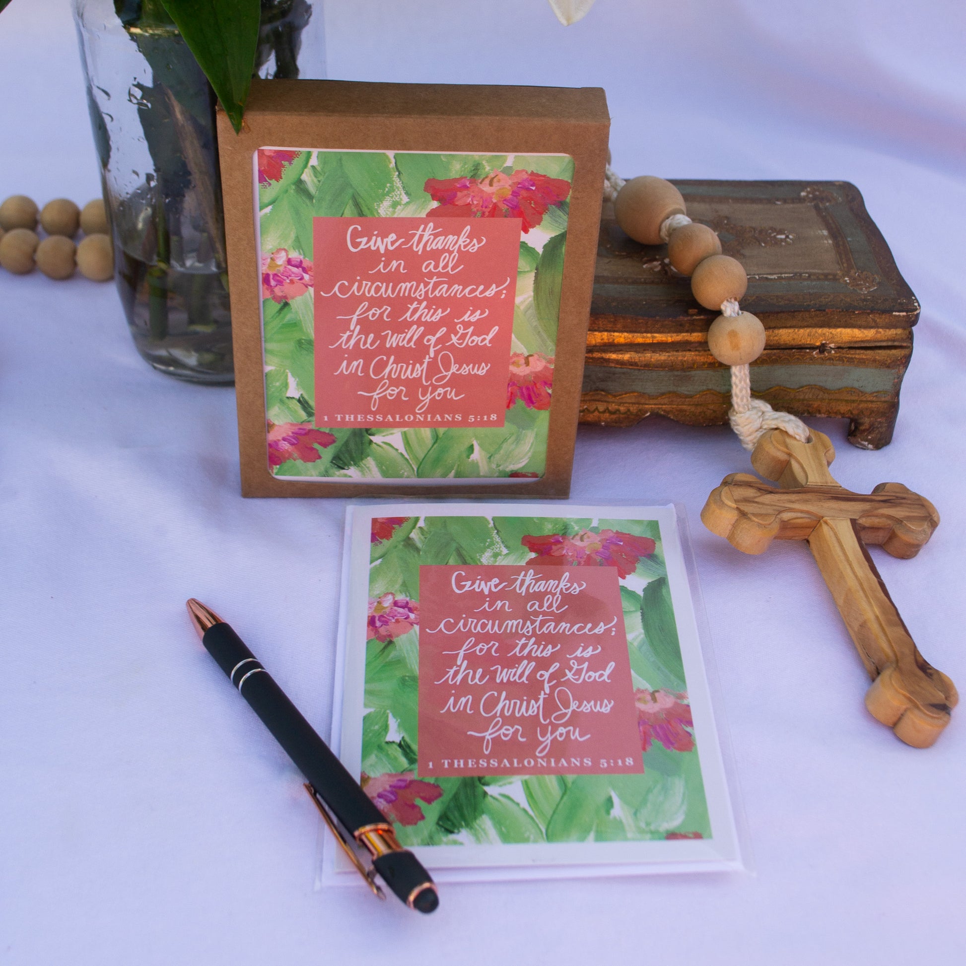 This card holds a beautiful reminder from St. Paul to give thanks to God in all things, for all things are for our good!