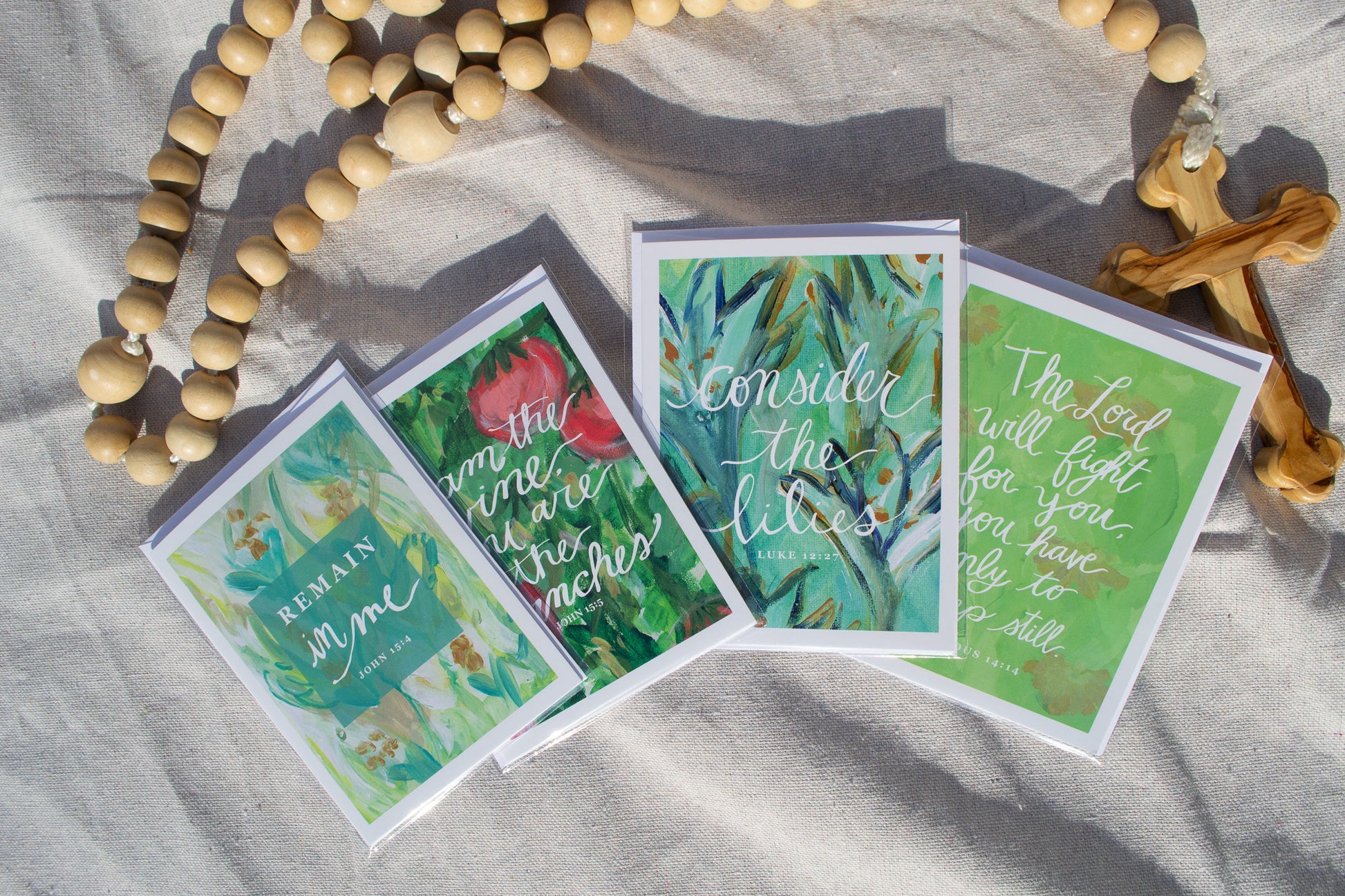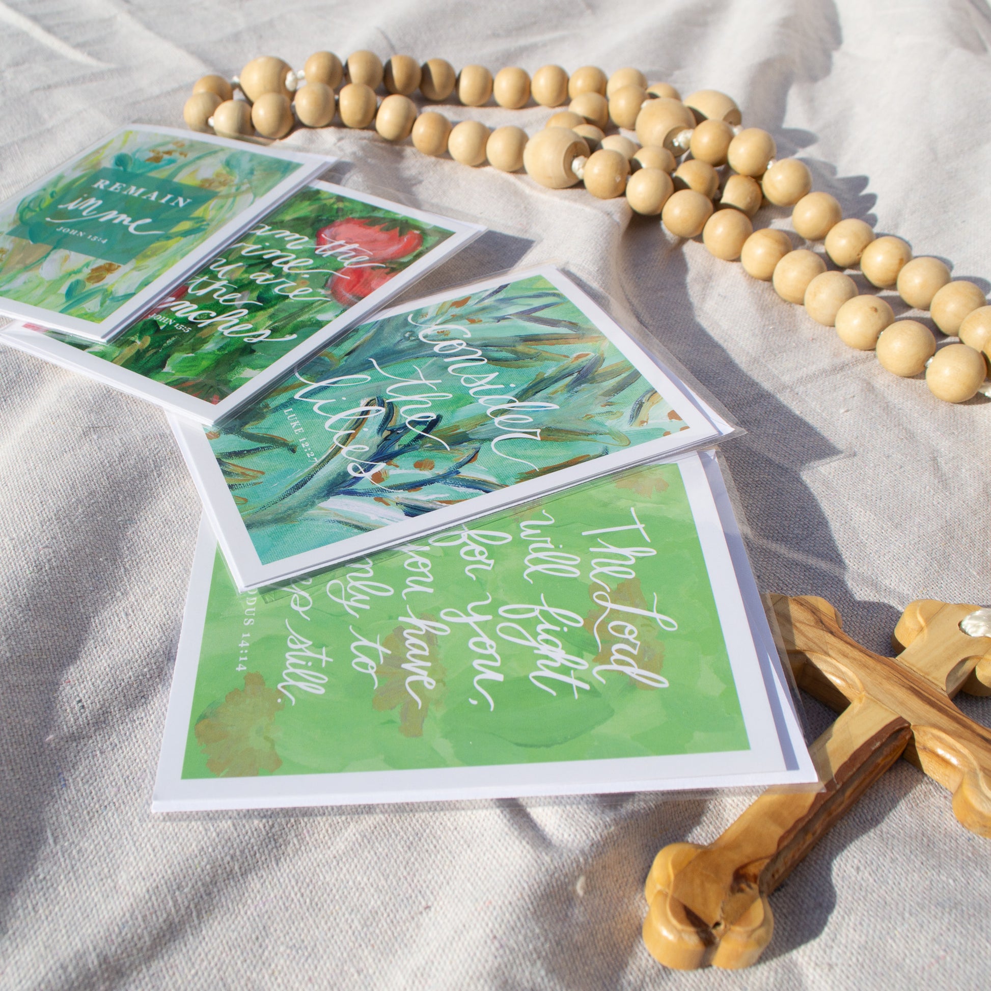 Let someone you love know that you're thinking about them with this vibrant set of greeting cards! This boxed set includes 8 cards with 4 different designs printed on 14lb cardstock. The Recipere Stationary Set is named for the Latin word meaning "to receive". The scripture verses chosen for this set all reflect an attitude of receptivity and openness to God's providence and goodness, no matter the circumstances we find ourselves in. Whether you're writing a thank you note or just letting a friend know you're thinking about them, the Recipere Stationary Set is the stationary for you!
